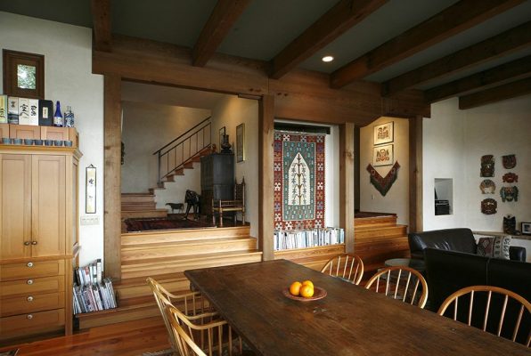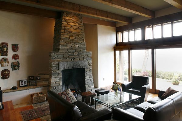 Most material, with the exception of framing lumber, is recycled, old growth redwood salvaged and collected over many years by colleagues in Northern California. An excellent example of a large, traditional Rumford fireplace is at the end of the main living hall.