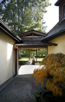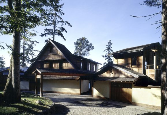Overlooking Puget Sound on Agate Pass, new construction. Concept: to create a ‘village’ with a rural Japanese farm feeling, looking out from behind a long stucco wall and appearing as if multiple structures were added to a compound over time.