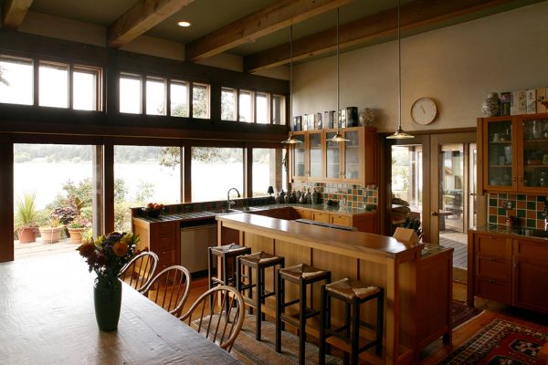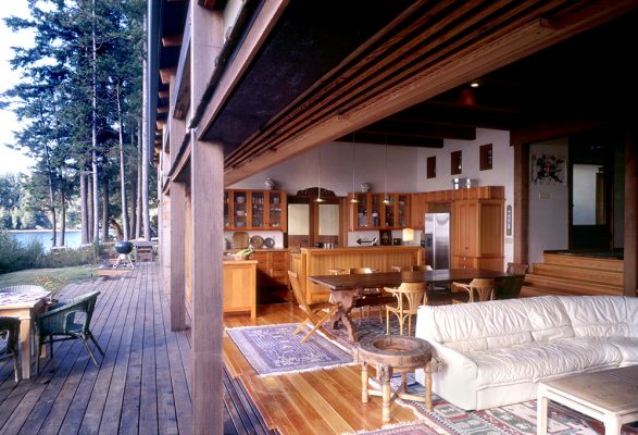 The Berg family requested a ‘movable wall’ that could be fully opened to the Sound in good weather, and this was accomplished with nine 4′ x 7′ shoji-like exterior glass doors that slide open and stack upon themselves at either end of the 36 foot opening of the main living space on warm days.
