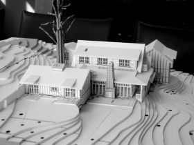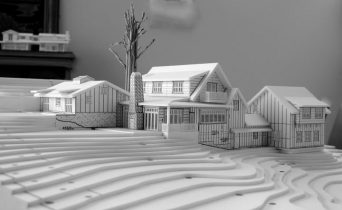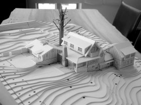 New family home on extensive acreage, bordering a large and protected wetland. Village architecture, having the look of a small village of several outbuildings instead of a single structure of one large volume. This concept lends itself to building forms of interconnected but simple geometry and an enclosed courtyard is formed naturally in the center of these forms. Sloping site creates interesting cluster of various height buildings and leads to surprising spaces.